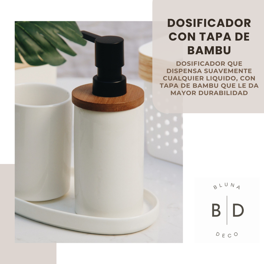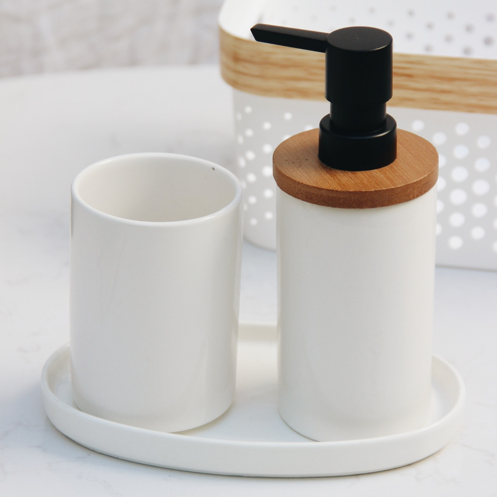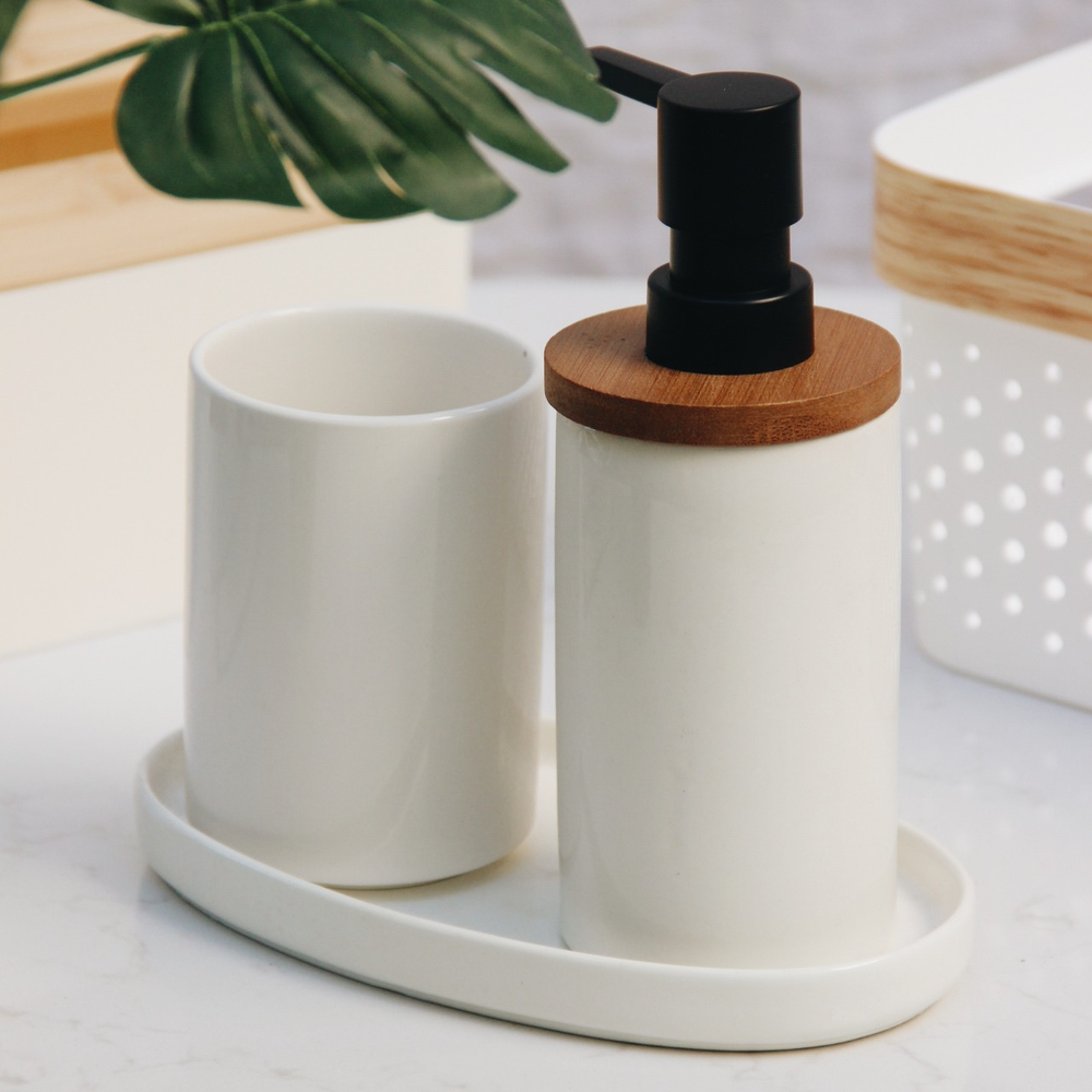 Descubrí el Set de Baño de Cerámica con tapa de bambú Tray, diseñado para aportar un estilo natural y sofisticado a tu baño. Este conjunto combina la calidez del bambú con la resistencia y belleza de la cerámica, creando un ambiente armonioso y relajante.
