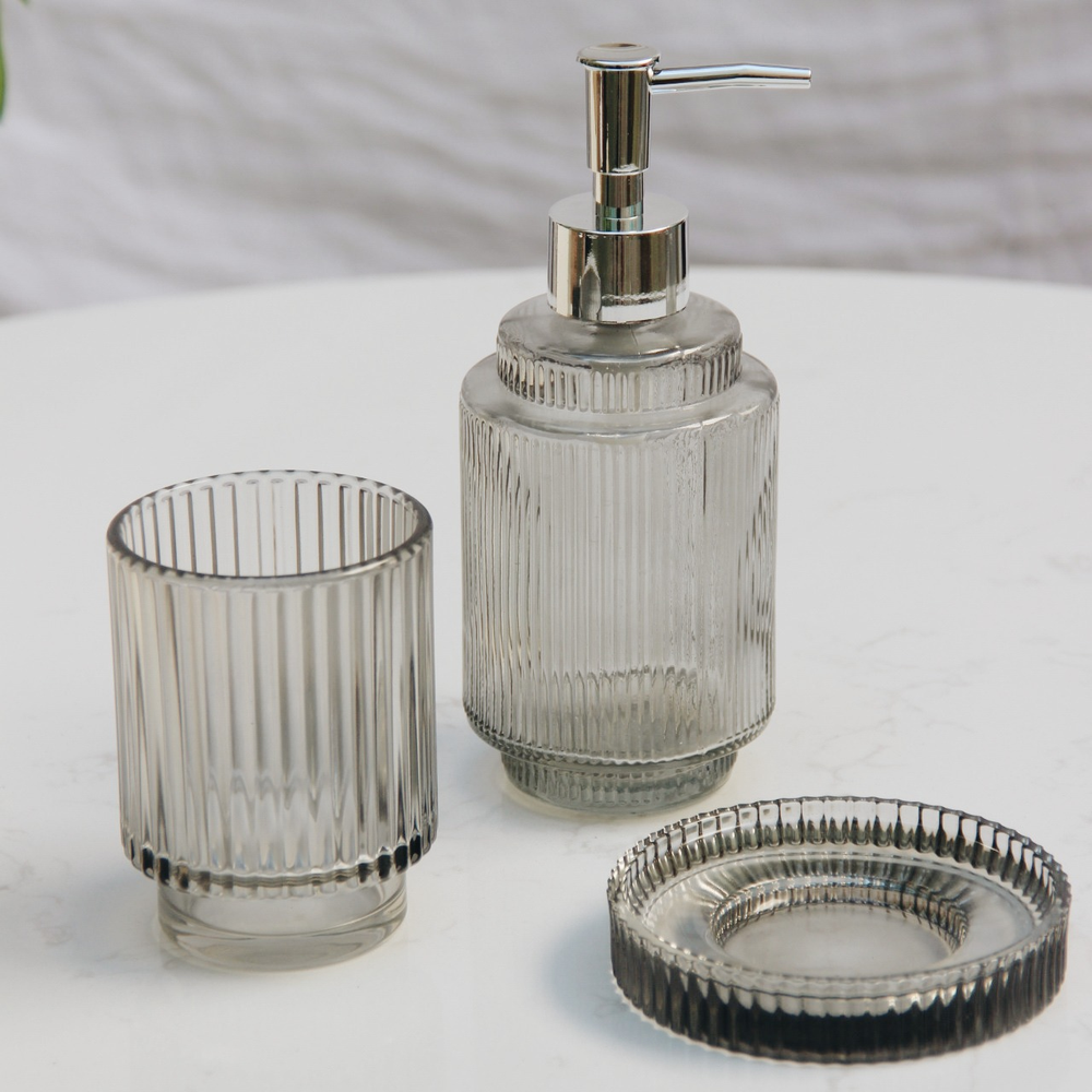 Dispenser de jabón (19 cm alto x 7,5 cm diámetro), ideal para dosificar jabón con facilidad y elegancia. Vaso (10 cm alto x 7,5 cm diámetro), perfecto para enjuague o para mantener tus cepillos ordenados. Jabonera (10 cm alto x 2,5 cm diámetro), práctica y estilizada para mantener tu jabón siempre a mano. Fabricado en vidrio fumé gris oscuro, este conjunto ofrece una estética sobria y contemporánea que combina con cualquier decoración. Su diseño minimalista y duradero facilita la limpieza y el mantenimiento diario.