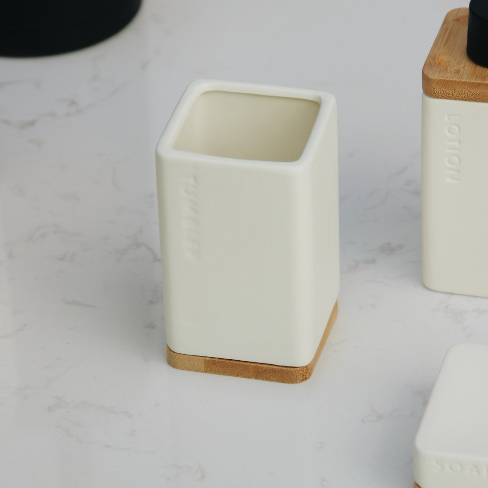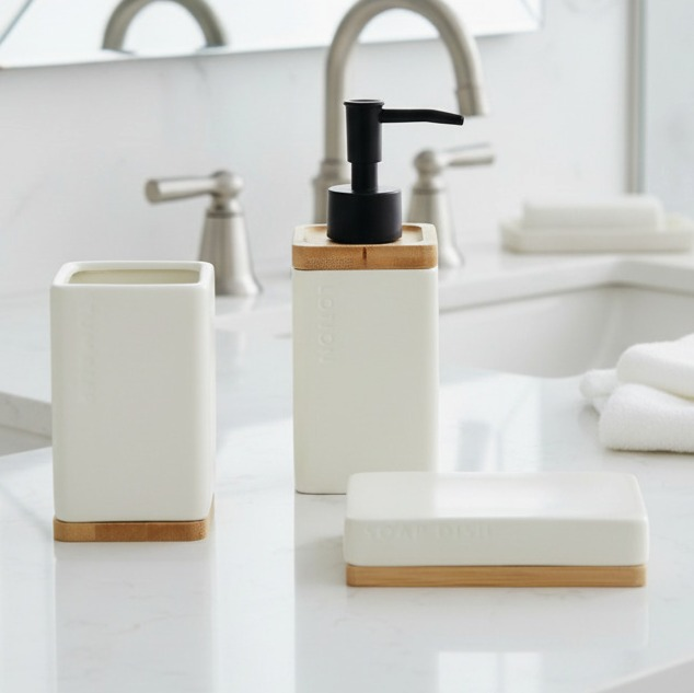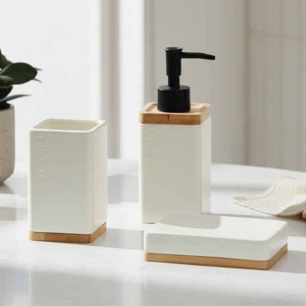 Descubrí la perfecta combinación entre cerámica de alta calidad y detalles en 100% bambú, que aporta un toque cálido y sofisticado a tu baño. Este set incluye tres piezas esenciales para mantener tu higiene diaria con estilo: