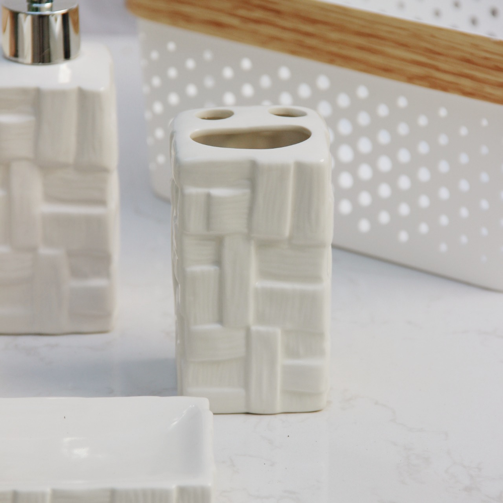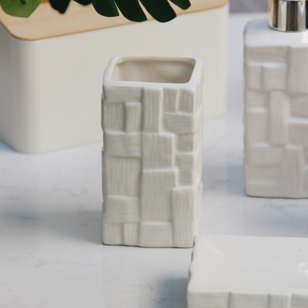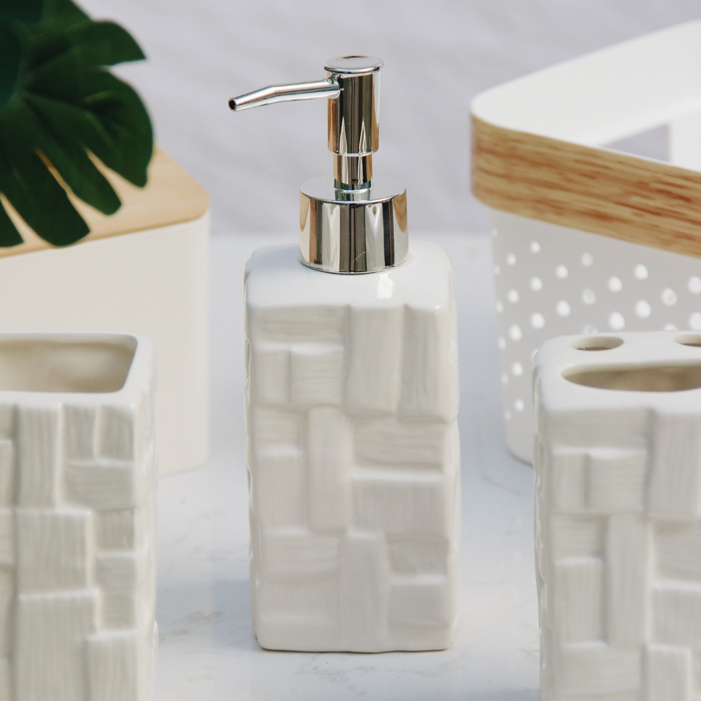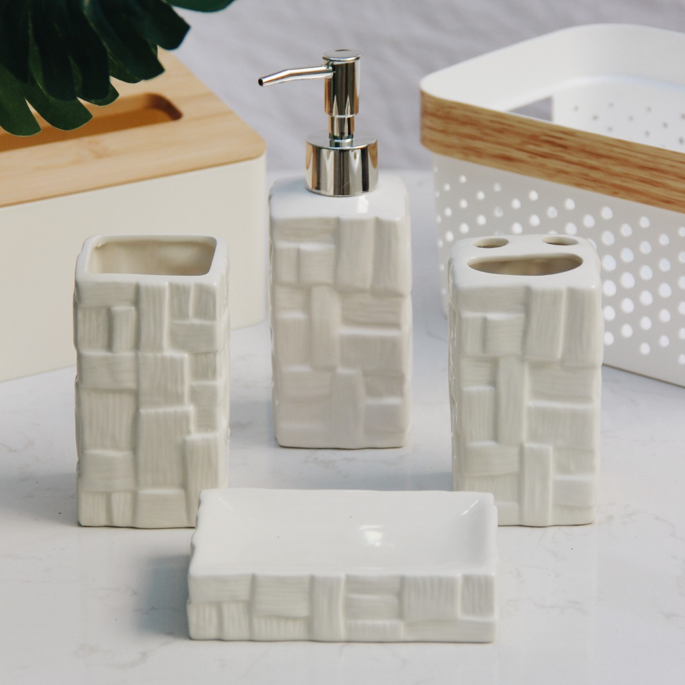 Este set de cerámica blanca incluye 4 piezas esenciales para tu rutina diaria: - Botella para desinfectante de manos (18 cm de alto x 6,5 cm de diámetro) - Vaso para enjuague bucal - Porta cepillo y pasta de dientes (11 cm de alto x 6,5 cm de diámetro) - Jabonera (12 cm de largo x 7,5 cm de ancho x 2,5 cm de alto)