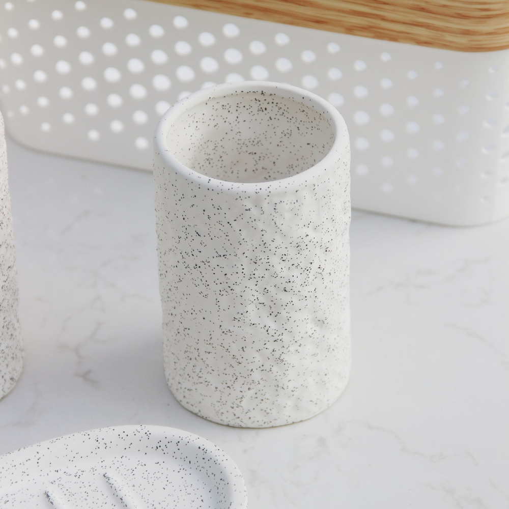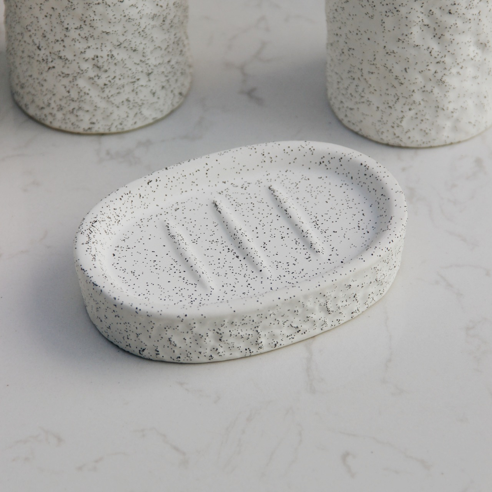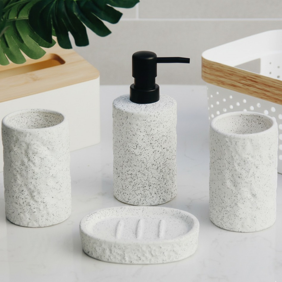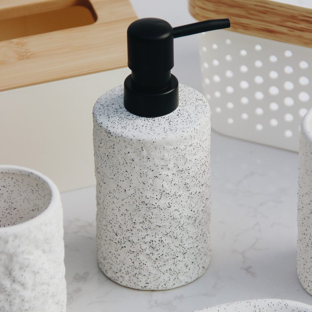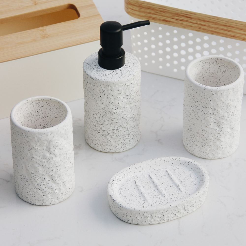 Descubrí el Set de Baño Dots, un conjunto de resina que combina estilo y practicidad con un acabado rugoso y puntitos negros que le dan un toque único y moderno a tu baño.