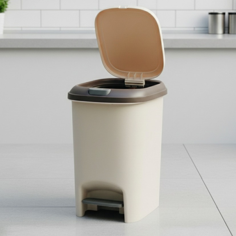 Con una capacidad de 10 litros y medidas compactas de 30 cm de alto por 23 cm de lado, es perfecto para cocinas y baños. Su diseño innovador incluye doble tapa: una con apertura a pedal para mayor higiene y comodidad, y otra con apertura manual para un acceso rápido.
