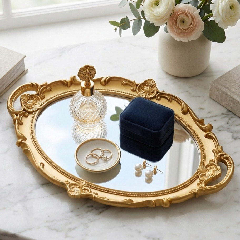 Su superficie espejada refleja delicadamente la luz, creando un efecto visual que enamora y aporta un toque de glamour. Elegí la Bandeja Victoria y transformá tus momentos cotidianos en experiencias llenas de encanto y buen gusto.